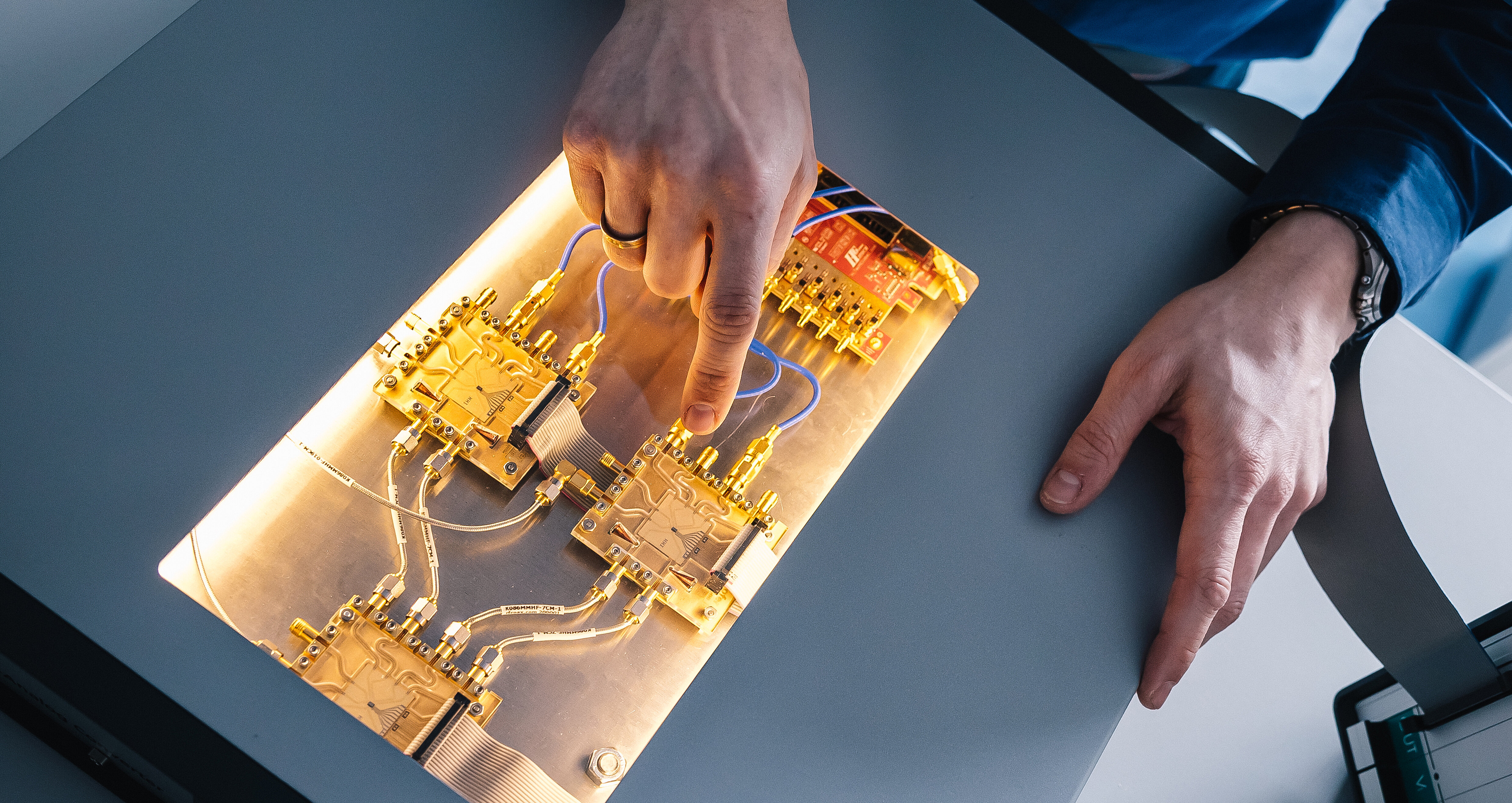 Dieser Hochgeschwindigkeits-Digital-Analog-Wandler (DAC) Prototyp verwendet unsere zum Patent angemeldete kaskadierte Analog-Multiplexing-Technologie und ermöglicht die Vervielfachung der Ausgangsbandbreite eines DACs. In diesem Prototyp werden die Ausgänge von vier 10 GS/s, FPGA-gesteuerte DACs in zwei Stufen miteinander verschränkt. Der Ansatz erlaubt jedoch auch die Verschränkung deutlich schnellerer DACs. Die Multiplikation der Abtastrate und der analogen Bandbreite wird durch unsere 2:1-Analogmultiplexer-ICs in SiGe-Technologie ermöglicht. Die integrierte FPGA-Plattform, konfiguriert als AWG, bietet 32 kS Speicher pro Kanal mit Kanal mit Offline-DSP. Durch Hinzufügen von Echtzeit-DSP kann das System um die Verarbeitung und Ausgabe eines Echtzeitdatenstroms erweitert werden. Das Konzept dient als kosteneffiziente Plattform für analoge Breitband-Signalerzeugung und Echtzeit-Signalübertragung im Labor.