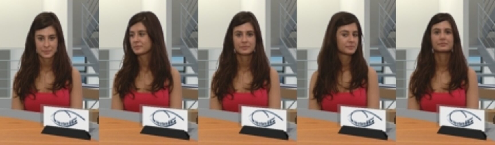 Realistic rendering of moving eyes and mouth is difficult to achieve. We therefore use the original image data from the camera to achieve realistic animation of face features. The area around the eyes and the mouth is cut out from the camera frames, warped to the correct position of the person in the virtual scene using the 3D head model, and smoothly merged into the synthetic representation using alpha blending.