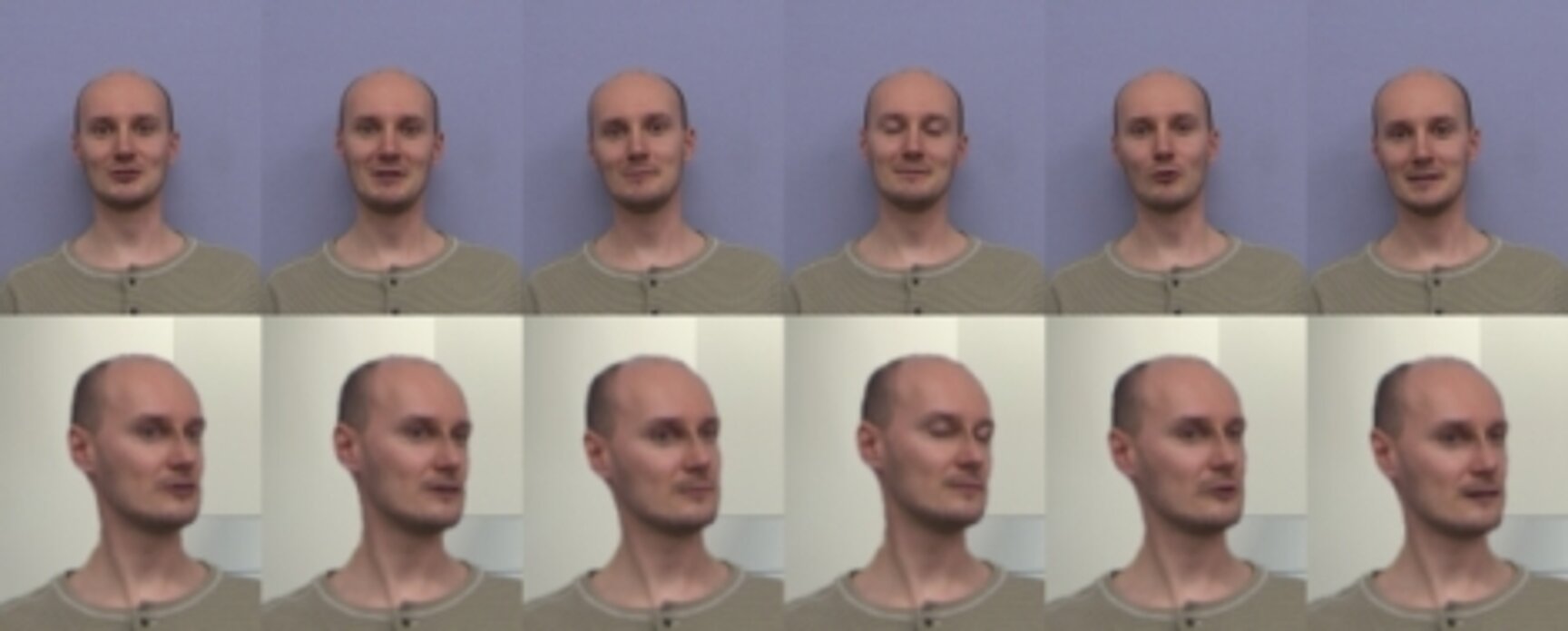 Head translation and head roll can be addressed by pure 2D motion, only head pitch needs some depth dependent warping. As long as the rotation angles are small which is true in most practical situations, the quality of the geometry can be rather poor. Also local deformations due to jaw movements are here represented by head model deformations. In order to combine both sources, alpha blending is used to smoothly blend between the warped image and the 3D model.