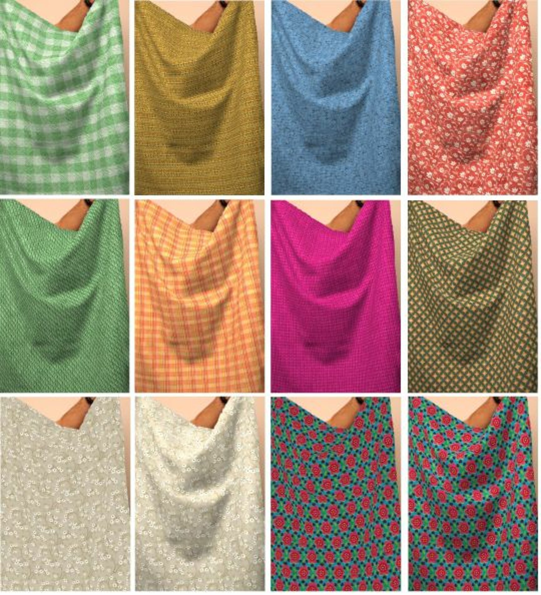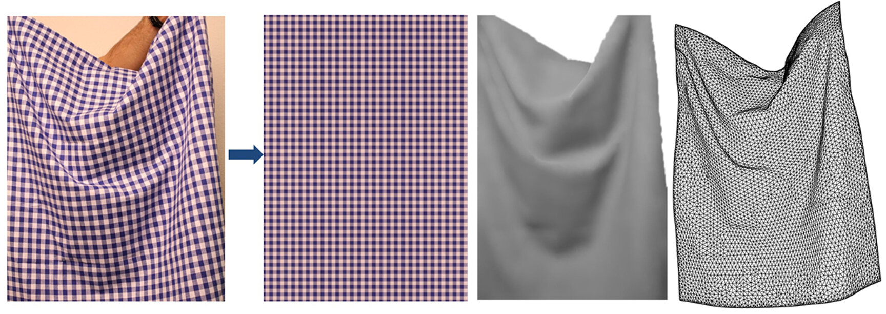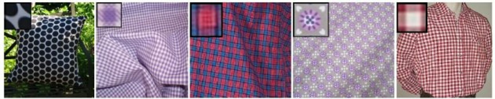This work specifically addresses the decomposition of images of deformed regular textures into its intrinsic parts which decompose the image into the appearance of the undeformed regular texture, a deformation field, a shading map representing lighting effects and additional high frequency details (see figure below). This is closely related to intrinsic image decomposition methods which decompose an arbitrary image into the product of an illumination component that represents lighting effects and a reflectance component related to the color of the observed material. In our decomposition model, the deformed regular texture (the estimated deformation field applied to the estimated appearance of the regular texture) can be seen as the reflectance part of our decomposition while the shading map and the high frequency details can be seen as the illumination component. Regular textures can be constructed by regularly tiling the texture space with the same texture element, called texel in the following. Textures that deviate geometrically and photometrically from a regular congruent tiling are often called near-regular textures (NRT) [Liu et al. 2004]. In contrast to regular textures, the texture elements appear geometrically and photometrically distorted in the image due to variations in the viewing angle, lighting conditions and partial occlusions. Nevertheless, they still exhibit certain topological regularities and relations as regular textures. We exploit this topological regularity to estimate the intrinsic parts of the given image of a near-regular texture. We first start by estimating the mean appearance of a texel and candidate positions of the texel in the image. From the estimated mean texel we synthetically generate an image of the regular texture. This image is used as reference in an image-based optimization method that registers two images not only geometrically but also photometrically, yielding a deformation field and a shading map. Finally, as the mean texel does not contain any high-frequency details, these can be estimated from the difference between the original image and the warped and shaded synthetic reference image.