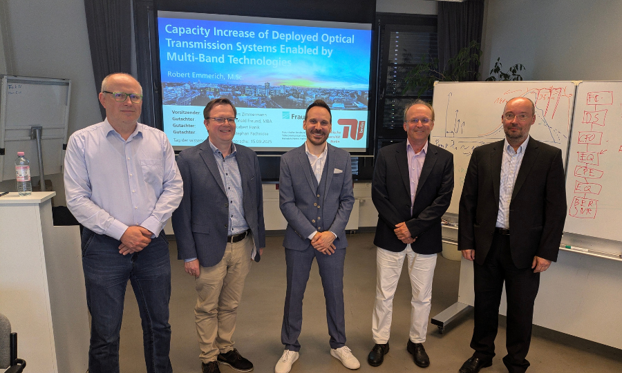 Robert Emmerich, senior scientist at the Fraunhofer Heinrich Hertz Institute (HHI), completed his doctorate at the Technical University of Berlin in September 2025 with the distinction “summa cum laude.” His dissertation, entitled “Capacity Increase of Deployed Optical Transmission Systems Enabled by Multi-Band Technologies,” addresses the forward-looking question of how existing fiber optic infrastructures can be efficiently expanded through the use of additional optical transmission bands.
