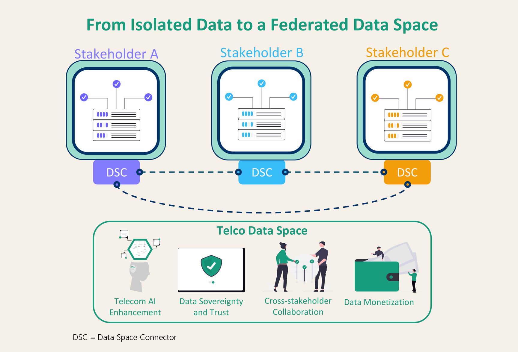 The Telco Data Space is powered by the Data Space Connector (DSC) which introduces a governance layer enabling:
