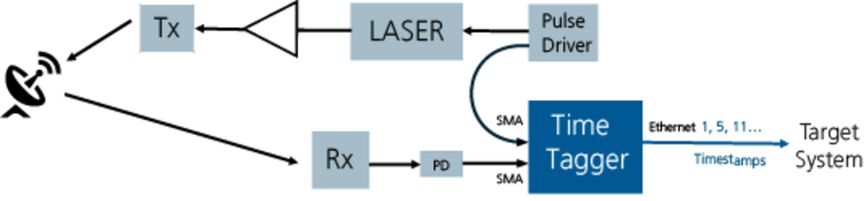 A laser generates short light pulses whose reflections are received by an optical antenna and converted into electrical signals by a photodiode. The Time-Tagger assigns precise timestamps to both the transmitted pulse and the received reflection. The time difference between these timestamps enables distance measurements with an accuracy of about 24 mm.