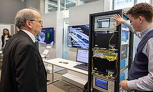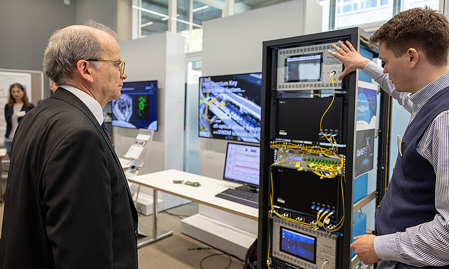 Im Rahmen des QuNET-Projekts entwickelt das Fraunhofer Heinrich-Hertz-Institut (HHI) Schlüsseltechnologien für die sichere Kommunikation der Zukunft basierend auf Quantenschlüsselverteilung (QKD). Ziel ist es, physikalisch abhörsichere Datenübertragung aus dem Labor in reale Netze zu bringen. So präsentierte Jan Krause, wissenschaftlicher Mitarbeiter am Fraunhofer HHI, das hauseigene QKD-System kürzlich Staatssekretär Dr. Rolf-Dieter Jungk (Bundesministerium für Forschung, Technologie und Raumfahrt) beim QuNET-Industrieworkshop 2025 – ein eindrucksvoller Beleg für den Fortschritt in Richtung industrieller Anwendung.